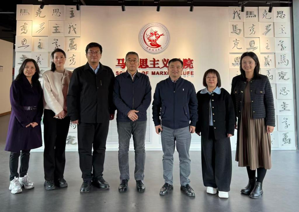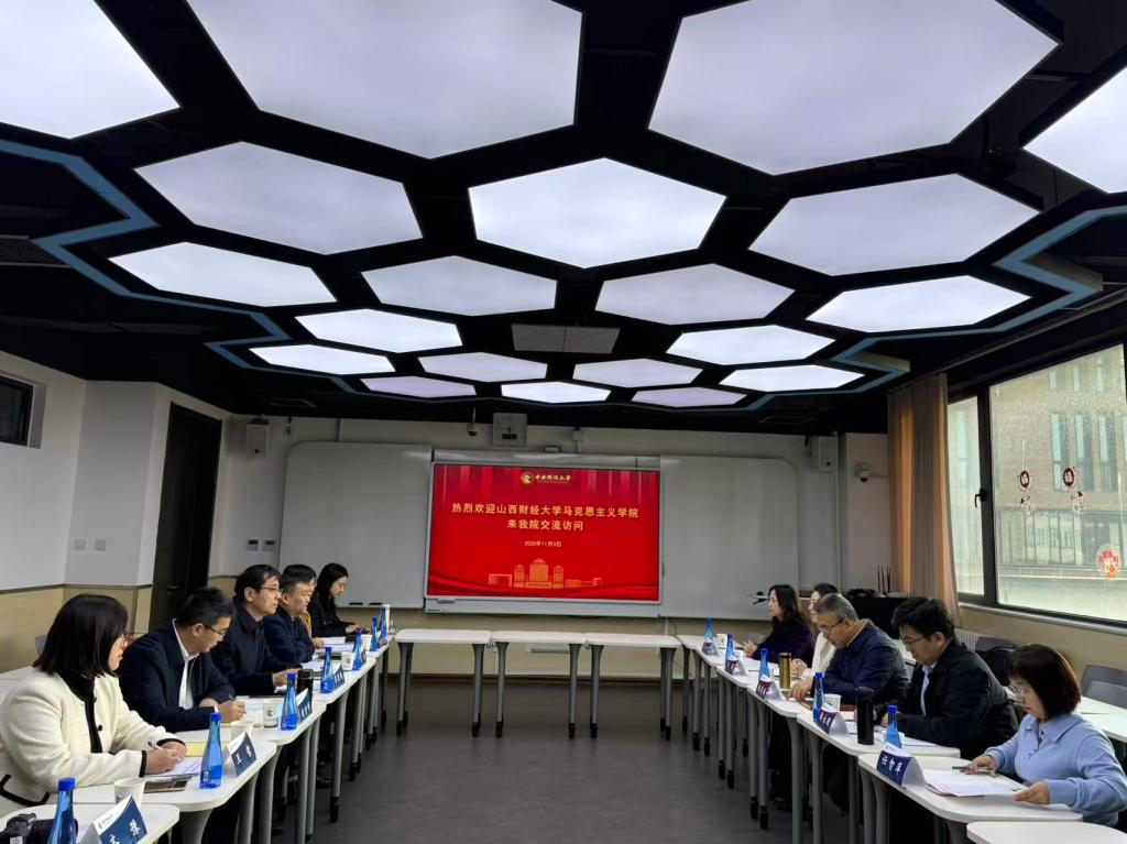 2025年11月3日,山西财经大学马克思主义学院院长杨茂林、副院长郭永园率队到访中央财经大学马克思主义学院,围绕学科建设、思政课教学、师资培育、实践教学、硕博生培养以及研究生就业等方面的工作开展交流研讨。黄刚院长主持座谈会,学院党委书记李爱民、副院长赵付科、中国近现代史纲要教研室党支部书记孙敏、组织员王哲、学生工作办公室主任刘明月、办公室科员齐豫等参加会议。